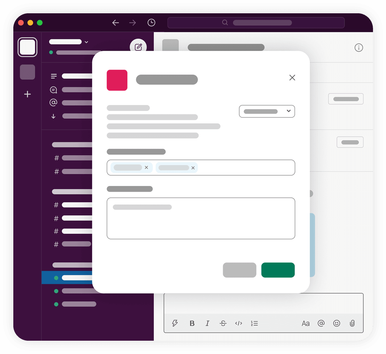 A modal is the Slack app equivalent of an alert box, pop-up, or dialog box. Modals capture and maintain focus within Slack until the user submits or dismisses the modal. This makes them a powerful piece of app functionality for engaging with users. Modals are available for both Bolt apps and Deno Slack SDK apps.